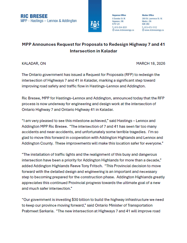 Ric Bresee, MPP for Hastings–Lennox and Addington, announced today that the RFP process is now underway for engineering and design work at the intersection of Ontario Highway 7 and Ontario Highway 41 in Kaladar.