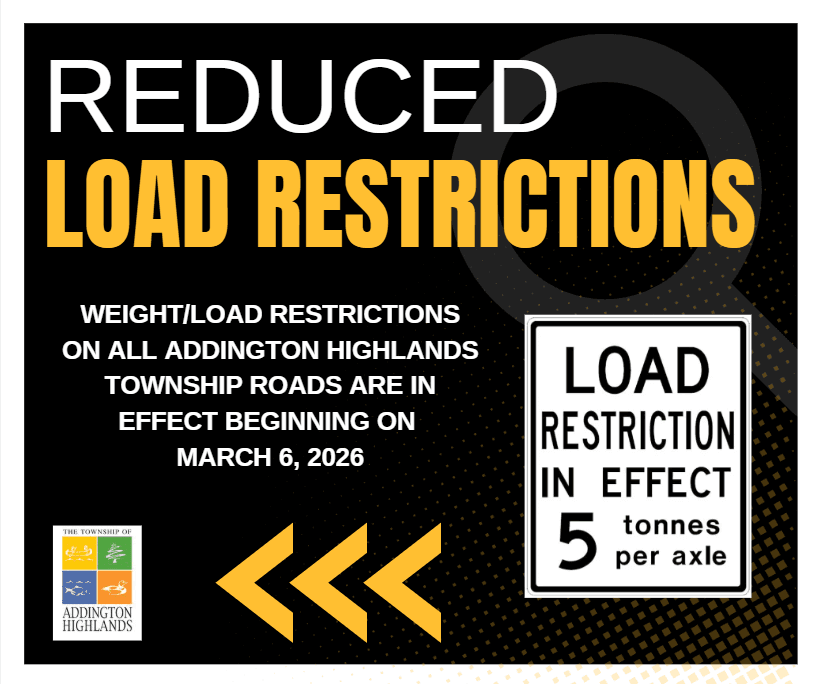 In accordance with the s.122, subsection (7), Chapter H.8, of the Highway Traffic Act, R.S.O.1990, and the Township of Addington Highlands By-law No. 0961/2025, as amended, a reduced load restriction will be in effect on all Township Roads as posted from March 6th, 2026.